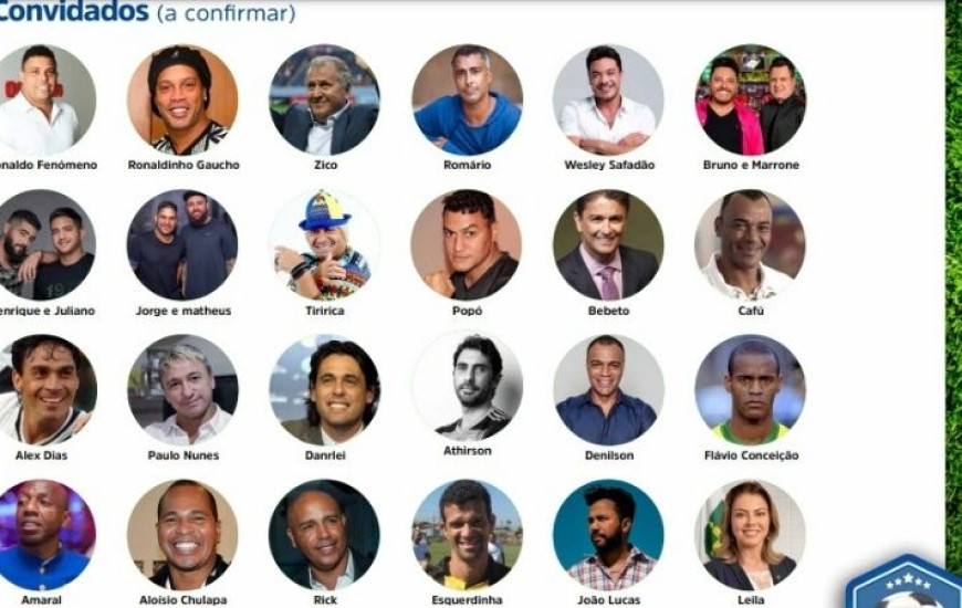 São convidados para o 5º Futebol Solidário: Ronaldo Fenômeno, Ronaldinho Gaúcho, Zico, Romário, Wesley Safadão, Bruno e Marrone, Jorge e Mateus, além de outros craques do futebol e artistas da música.