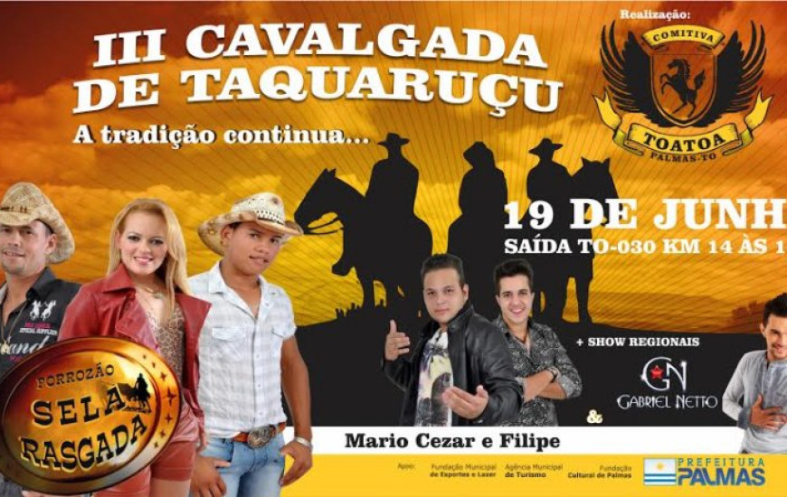 O distrito de Taquaruçu recebe no dia 19 de junho, a III Edição da Cavalgada de Taquaruçu, realizada pela Comitiva Toa Toa, e que neste ano, terá o apoio da Prefeitura de Palmas através da Fundação Cultural de palmas, Agência Municipal de Turismo e Fundação Municipal de Esportes e Lazer.