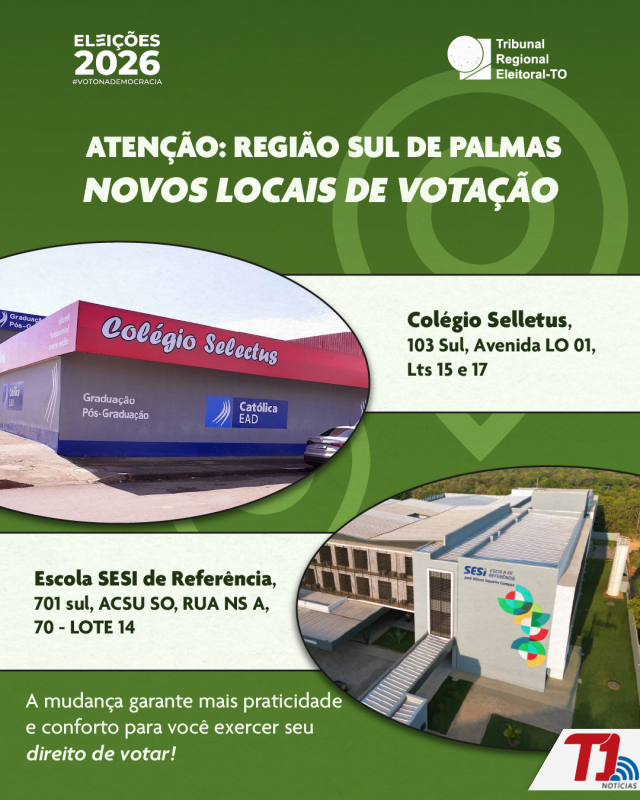 A 29ª Zona Eleitoral de Palmas anunciou a criação de dois novos locais de votação para atender ao crescimento do eleitorado na capital, que já ultrapassa a marca de 210 mil votantes aptos. As novas seções funcionarão no Colégio Selletus, na quadra 103 Sul, e na Escola SESI de Referência, na quadra 701 Sul.