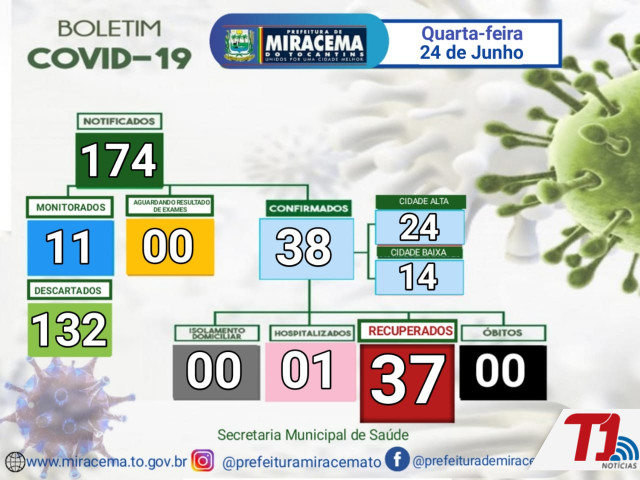 Conforme Boletim Epidemiológico Municipal desta quarta-feira, 24, Miracema não registra novos casos de covid-19 e mais 02 pacientes dos casos confirmados recebem alta. Hoje, três novas notificações foram registradas, uma testou negativo e já foi descartada e as outras duas permanecem em monitoramento domiciliar.