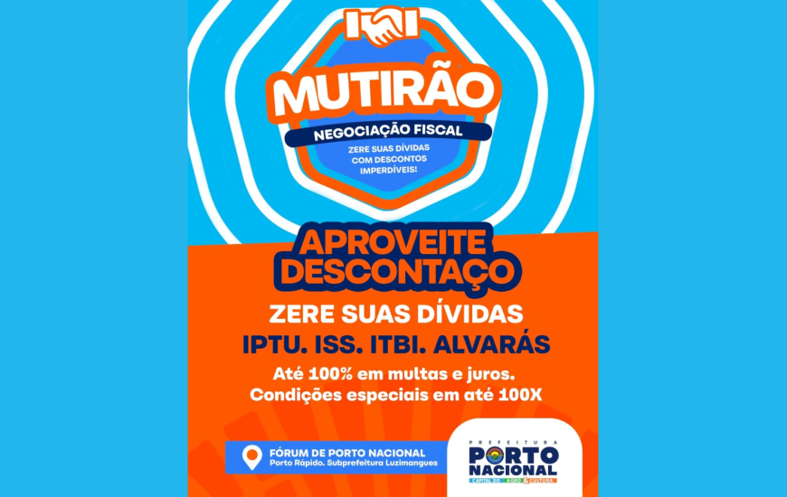 Entre os dias 3 e 7 de novembro, moradores de Porto Nacional terão a oportunidade de quitar suas dívidas com a prefeitura. O Mutirão de Negociações Fiscais ofecerá condições especiais, com o intuito facilitar a regularização de créditos fiscais e não fiscais do município, inscritos ou não em dívida ativa, além de reduzir o volume de processos judiciais e multas. A iniciativa é da Secretaria Municipal da Fazenda e da Procuradoria Geral do Município, em parceria com o Poder Judiciário.