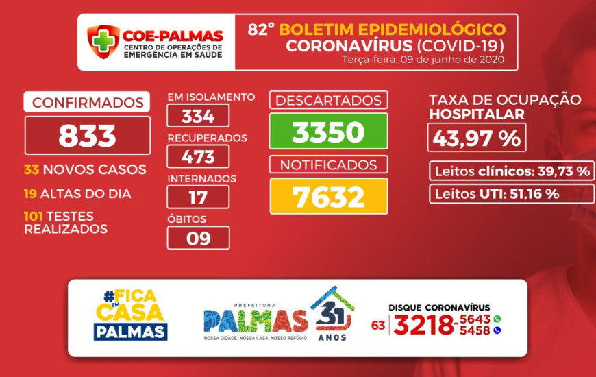 Divulgado na noite desta terça-feira, 09, o Boletim Epidemiológico de Palmas informando 833 casos de Covid-19 na Capital (acumulados), após a confirmação de 33 novos diagnósticos positivos após a rotina de exames desta segunda-feira, 8. Segundo a Vigilância Epidemiológica, do total de casos confirmados, 473 (56,8%) pacientes estão recuperados, número superior ao total de pacientes em tratamento, que soma 334 (40,1%) em isolamento domiciliar e 17 internados (2%). A Capital também contabiliza nove óbitos, o que aponta a letalidade de 1,1% dos casos confirmados.