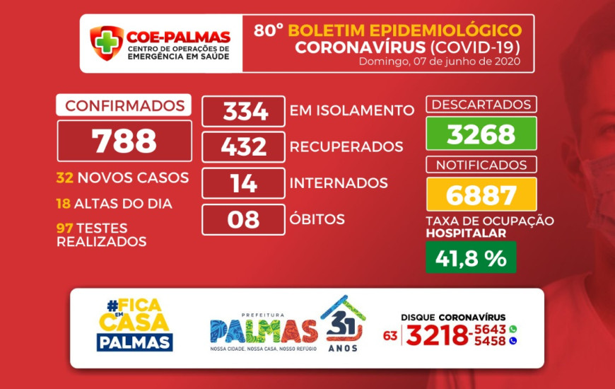 Segundo o Centro de Operações de Emergência em Saúde (COE Palmas), a taxa de ocupação hospitalar é de 41,8% e a letalidade 1,0%. Atualmente, 334 pessoas estão em isolamento domiciliar e 14 estão internadas.