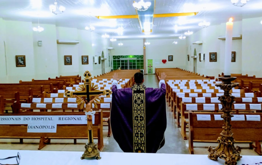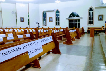 Na noite desta terça-feira, 7, o Padre Tiago Augusto, celebrou na Paróquia de São José, missa em homenagem aos profissionais da saúde de Dianópolis. Como não pode haver aglomeração, o sacerdote reuniu os nomes dos profissionais da saúde do município e do Hospital Regional (HRD) escritos em folhas de papéis A4, colados nos bancos da Igreja Matriz. “É uma forma de estarmos unidos. Temos pedido diariamente em oração, que Deus proteja estes profissionais, não apenas os da saúde, mas todo aquele que está na linha de frente, por nós”, descreveu o Pároco.