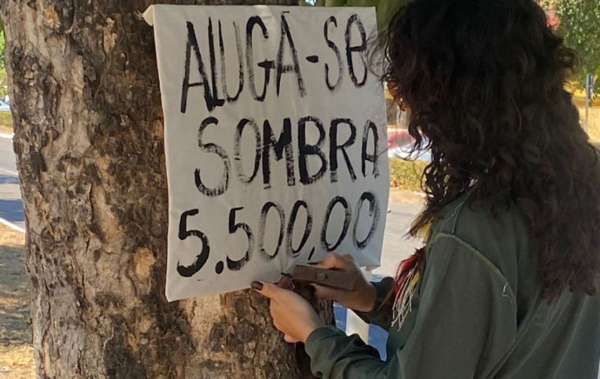 Na obra, placas com dizeres como “aluga-se” e “vende-se sombra” foram espalhadas pela cidade, acompanhadas de valores fictícios. A performance expõe o contraste entre o preço elevado do mercado imobiliário local e a carência de áreas sombreadas e de lazer na capital mais jovem do Brasil.