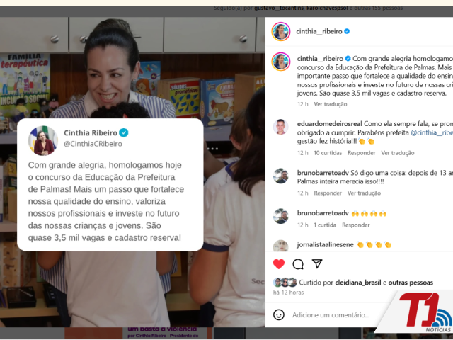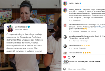 Nas redes sociais, a prefeita Cinthia comemorou: "com grande alegria, homologamos hoje o concurso da Educação da Prefeitura de Palmas! Um passo essencial para fortalecer ainda mais a qualidade do ensino, valorizando nossos profissionais e investindo no futuro das nossas crianças e jovens. São quase 3,5 mil vagas e cadastro".