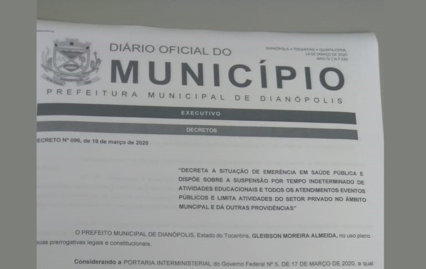 A Prefeitura de Dianópolis, publicou na manhã desta quinta-feira, 19, o Decreto n° 096/2020, decretando situação de emergência no município e suspensão por tempo indeterminado de atividades educacionais e todos os atendimentos públicos, limitando também a realização de eventos públicos e atividades do setor privado em âmbito municipal por causa da pandemia do coronavírus (Covid-19). O Decreto Oficial do Município foi publicado na edição 330 do DOM, um dia após a confirmação do primeiro caso testado positivo para o Covid-19, no Tocantins, com diagnóstico em Palmas.
