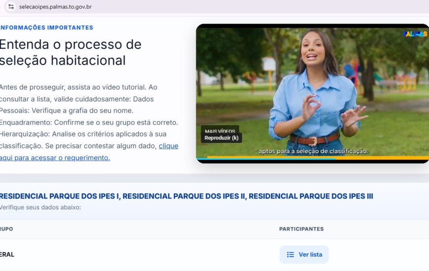 A Prefeitura de Palmas publicou nesta sexta-feira, 13, em edição suplementar do Diário Oficial do Município, portaria que detalha os critérios de hierarquização utilizados e a lista de famílias habilitadas a participar do processo de seleção e hierarquização das unidades habitacionais dos Empreendimentos Residenciais Parque dos Ipês I, II e III. O processo refere-se à destinação de 496 unidades habitacionais, no âmbito do Programa Minha Casa, Minha Vida – Faixa 1, com recursos do Fundo de Arrendamento Residencial (FAR).