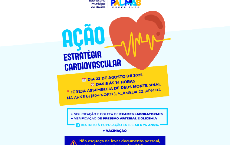Ocorre neste sábado, 23, das 8 às 14h, a "Ação Estratégia Cardiovascular", iniciativa da Prefeitura de Palmas, via Secretaria Municipal de Saúde (Semus), que ofecerá de forma gratuita exames laboratoriais, verificação de pressão arterial e glicemia para pessoas de 40 a 74 anos. A programação será na Igreja Assembleia de Deus Monte Sinai, na Arne 61 (504 Norte) e é destinada a moradores das Arnes 41 (304 Norte), 51 (404 Norte), 53 (406 Norte), 63 (506 Norte), 61 (504 Norte) e 71 (604 Norte).