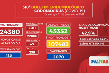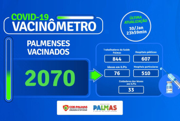 O boletim epidemiológico deste domingo, 31, informou o quantitativo de pessoas vacinadas contra a Covid-19 em Palmas até este sábado, 30. Ao todo, 2.070 pessoas receberam a primeira dose da CoronaVac, sendo: 1.961 profissionais de saúde, 76 idosos em instituições de longa permanência e 33 cuidadores desses idosos.