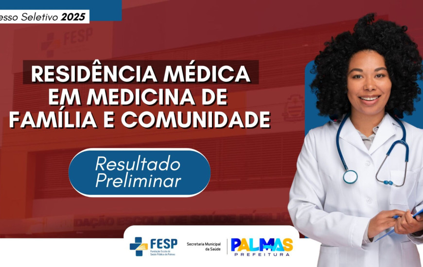 O resultado preliminar do processo seletivo para ingresso no Programa de Residência de Medicina de Família e Comunidade (PRMFC) foi divulgado nesta segunda-feira, 10, pela Prefeitura de Palmas, por meio da Fundação Escola de Saúde Pública de Palmas (Fesp).