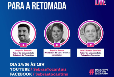 Nesta quarta-feira, 24, o Sebrae Tocantins promoverá uma discussão on-line com o reitor da Universidade Federal do Tocantins (UFT), Luís Bovolato, e o reitor da Universidade Estadual do Tocantins (Unitins), Augusto Rezende.