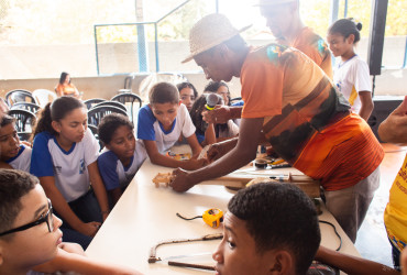 À tarde, a programação trouxe uma oficina com o percussionista Marcio Bello, do grupo Tambores do Tocantins, que apresentou aos estudantes instrumentos musicais rudimentares utilizados na percussão como a cabaça, a concha, o tambor de barro e o berimbau, utilizados na percussão.