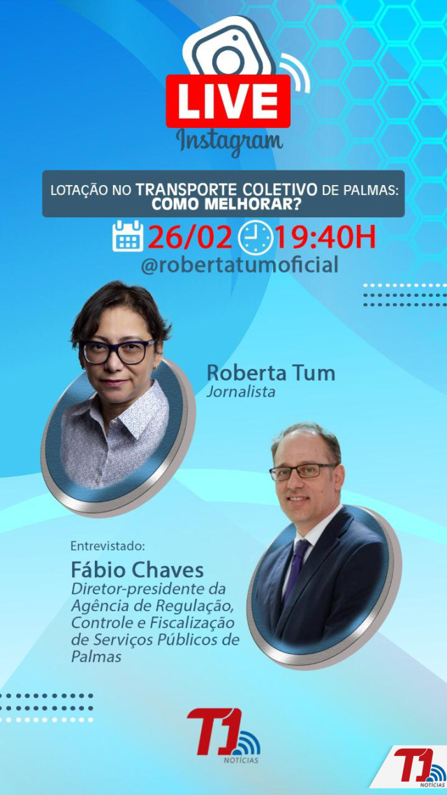 Nesta sexta-feira, 26, o T1 Notícias promove a live “lotação no transporte coletivo de Palmas: como melhorar?” com duas entrevistas, uma às 19h e outra às 19h40. A jornalista Roberta Tum entrevistará o presidente do Sindicato das Empresas de Transporte Coletivo Urbano de Passageiros (Seturb), Antônio Silva Júnior, e o diretor-presidente da Agência de Regulação, Controle e Fiscalização de Serviços Públicos de Palmas (ARP), Fábio Chaves. A transmissão será por meio do instagram: @robertatumoficial.