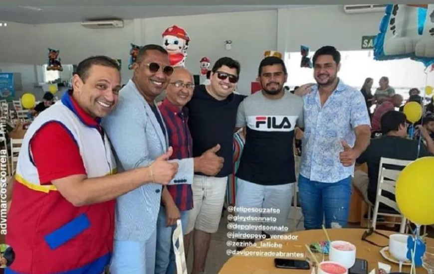 Em uma foto tirada no evento aparecem o vice-prefeito, os vereadores Davi Abrantes (PTB), Zezinho da Lafiche (Avante), Jair do Povo (Pros) e mais duas pessoas, todos abraçados e sem máscaras.