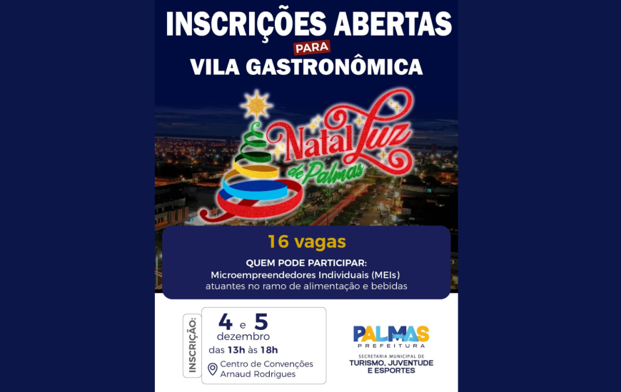Começam nesta quinta-feira, 4, as inscrições para microempreendedores interessados em participar da Vila Gastronômica do Natal Luz de Palmas, no Parque Cesamar. Podem se inscrever MEIs do ramo da alimentação e bebidas que atendam as exigências estabelecidas no edital publicado no último dia 3, no Diário Oficial do Município.