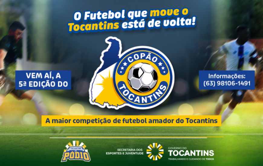 O Governo do Tocantins, por meio da Secretaria dos Esportes e Juventude (Seju), lança nesta terça-feira, 17, a 5ª edição do Copão Tocantins. A cerimônia ocorre às 9h30, no Palácio Araguaia Governador José Wilson Siqueira Campos, em Palmas, com a presença de dirigentes e atletas. O torneio de futebol amador distribuirá mais de R$ 240 mil em premiações nesta temporada.