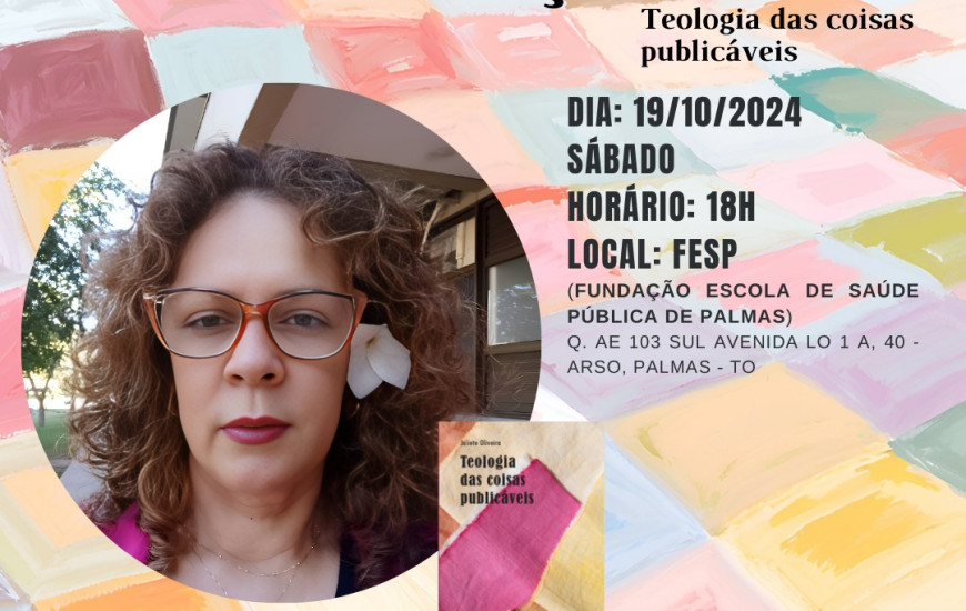 Juliete Oliveira lança sua mais recente obra, "Teologia das Coisas Publicáveis", neste sábado, 19 de outubro, às 18h, na Fundação Escola de Saúde Pública de Palmas (Fesp). Com prefácio da professora Glória Azevedo e orelha assinada por Veza Manuela, o evento promete reunir amigos e leitores para celebrar a poesia. O endereço é 103 Sul, Avenida LO 1A, ao lado da churrascaria Tins Mania.