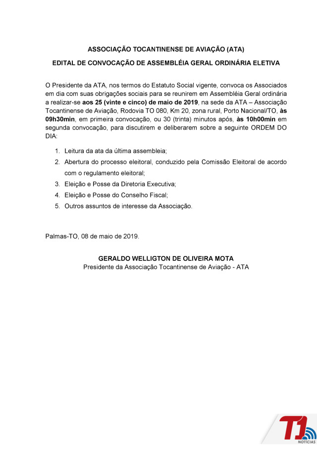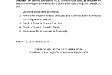 O Presidente da ATA, nos termos do Estatuto Social vigente, convoca os associados em dia com suas obrigações sociais para se reunirem em Assembléia Geral Ordinária a realizar-se aos 25 (vinte e cinco) de maio de 2019. Veja o Edital aqui.