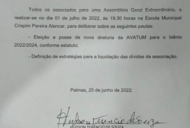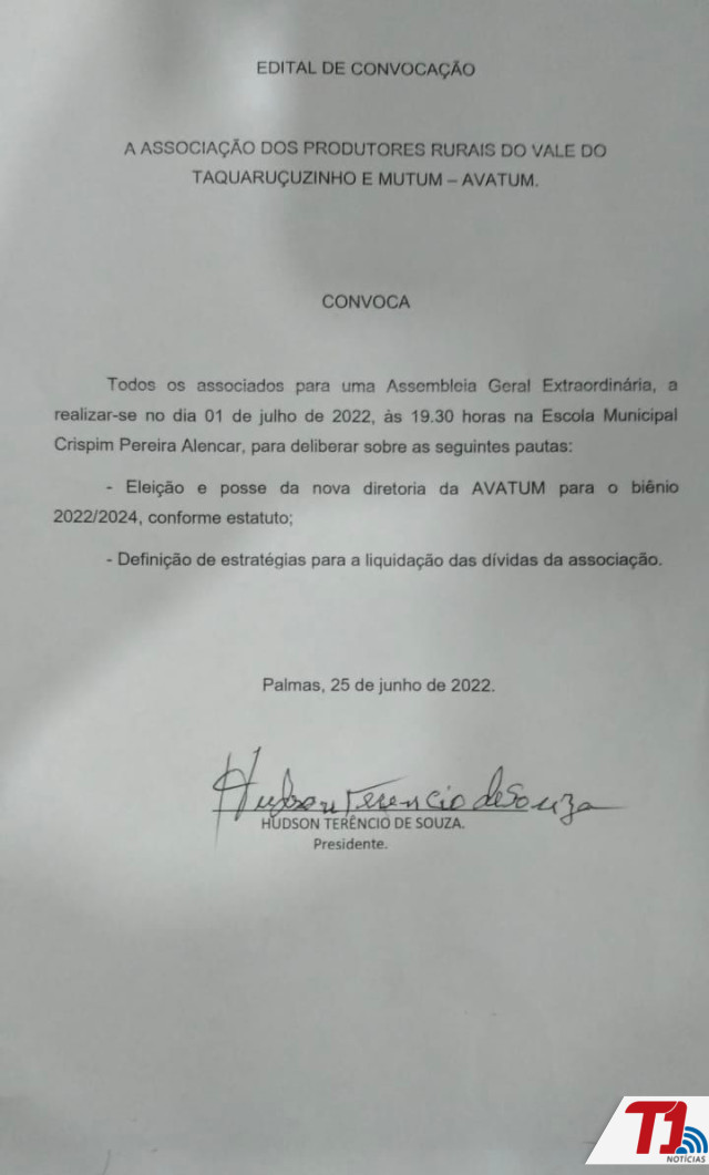A Associação dos Produtores Rurais do Vale do Taquaruçuzinho e Mutum - AVATUM convoca todos os associados para uma Assembleia Geral Extraordinária, a realizar-se no dia 01 de julho de 2022, às 19h30, na Escola Municipal Crispim Pereira Alencar, para deliberar as seguintes pautas: