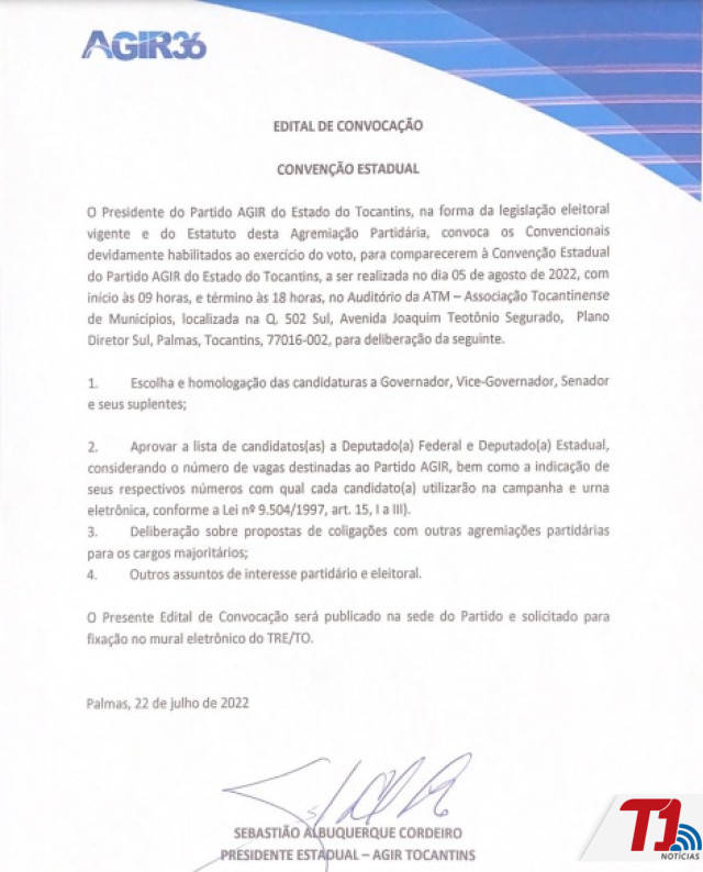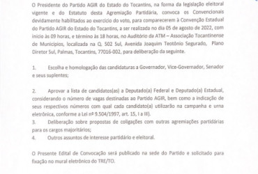 O presidente do AGIR do Estado do Tocantins, na forma da legislação eleitoral vigente e do Estatuto desta Agremiação Partidária, convoca os Convencionais devidamente habilitados ao exercício do voto, para comparecerem à Convenção Estadual do partido AGIR do Estado do Tocantins, a ser realizada no dia 05 de agosto de 2022, com início às 09 horas e término às 18 horas, no auditório da ATM - Associação Tocantinense de Municípios, localizada na Quadra 502 Sul, Avenida Joaquim Teotônio Segurado, Plano Diretor Sul, Palmas, Tocantins, 77016-002, para deliberação da seguinte:
