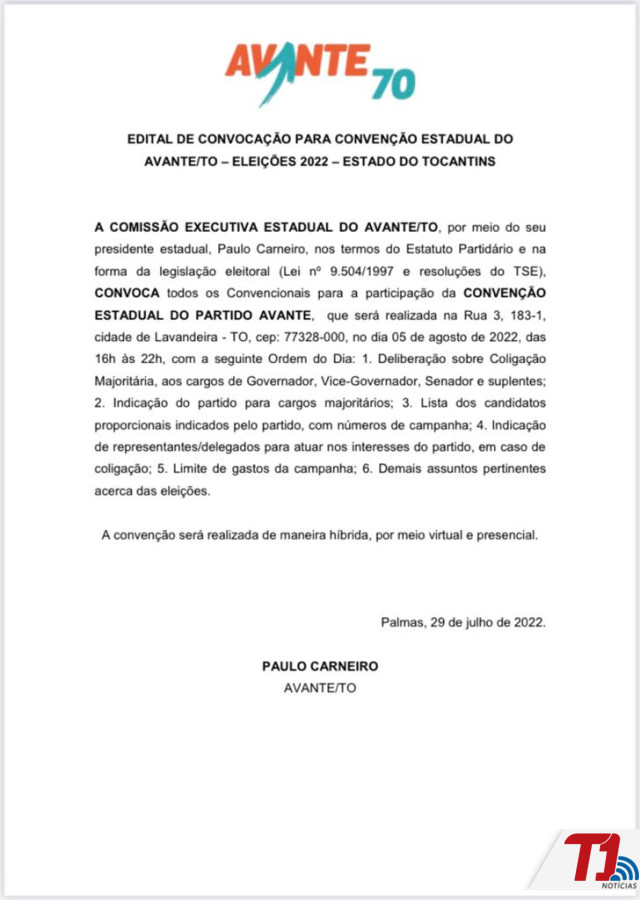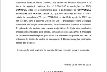 A COMISSÃO EXECUTIVA ESTADUAL DO AVANTE/TO, por meio do seu presidente estadual, Paulo Carneiro, nos termos do Estatuto Partidário e na forma da legislação eleitoral (Lei nº 9.504/1997 e resoluções do TSE), CONVOCA todos os Convencionais para a participação da CONVENÇÃO ESTADUAL DO PARTIDO AVANTE, que será realizada na Rua 3, 183-1, cidade de Lavandeira - TO, cep: 77328-000, no dia 05 de agosto de 2022, das 16h às 22h, com a seguinte Ordem do Dia: