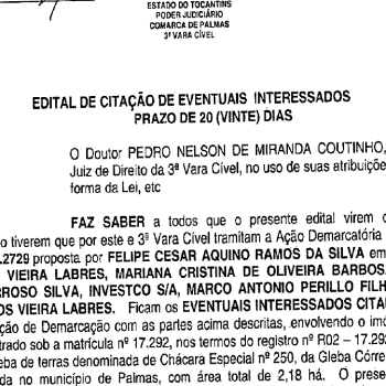 Confira Edital de Citação referente a Ação Demarcatória de terras em Palmas