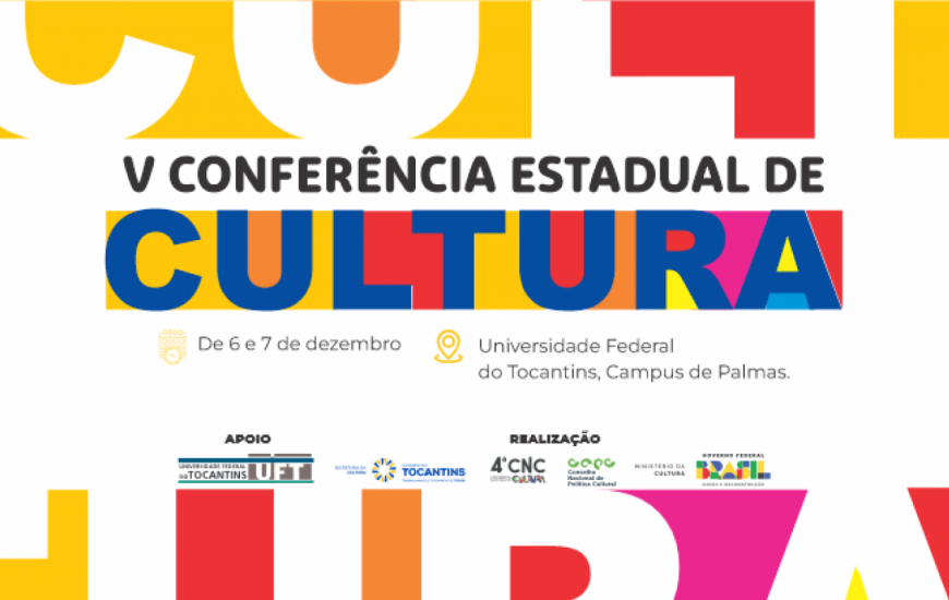 Ocorre nesta quarta-feira, 6, e quinta-feira, 7, das 8h às 17h, na Universidade Federal do Tocantins (UFT), câmpus de Palmas, a 5ª Conferência Estadual de Cultura. O evento é promovido pelo Governo do Tocantins, por meio da Secretaria de Estado da Cultura (Secult), como parte integrante da etapa nacional, a ser realizada em Brasília (DF), em março de 2024. As inscrições podem ser feitas neste link.
