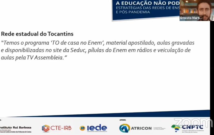O diretor do Interdisciplinaridade e Evidências no Debate Educacional (Iede), Ernesto Martins Faria, conduziu o bloco de compartilhamento de experiências e comentou o empenho do Tocantins. “A rede estadual de Tocantins desenvolveu várias estratégias online, além de pensar nos estudantes que não têm acesso, para que possam estudar de casa, com material disponibilizado para garantir o acesso”, pontuou.