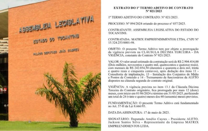 Foi publicado na edição nº 3794 do Diário Oficial da Assembleia Legislativa (Aleto) o 1° Termo Aditivo do contrato que prorroga a vigência contratual com a empresa Matrix Empreendimentos Ltda.