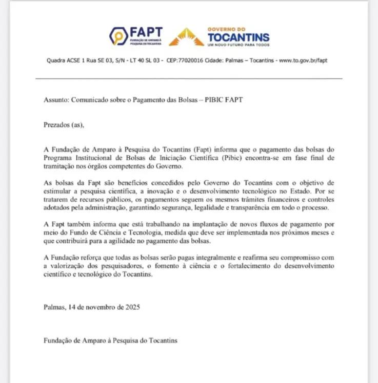 A entidade garantiu que “todas as bolsas serão pagas integralmente” e reafirmou o compromisso com a valorização dos pesquisadores e o desenvolvimento científico e tecnológico no Tocantins.