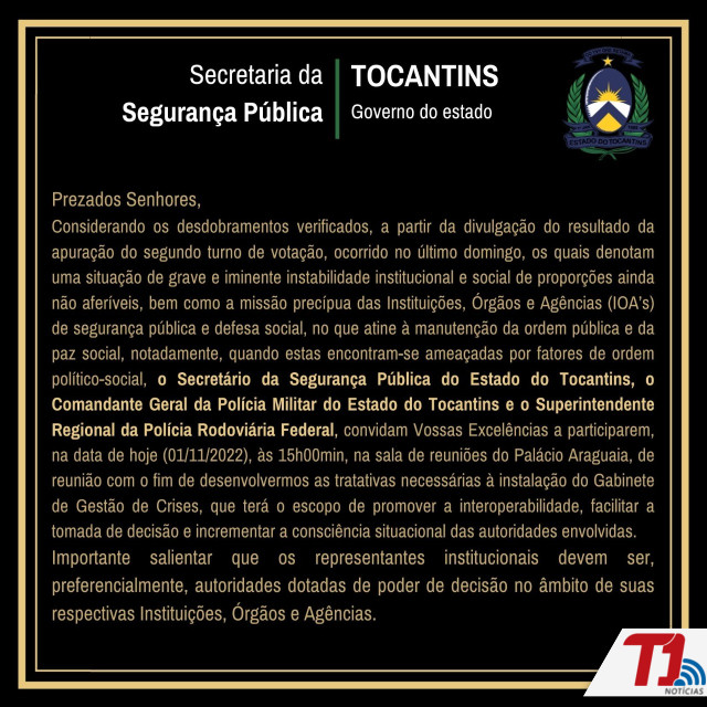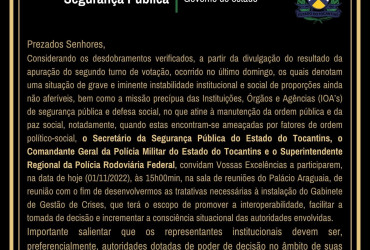 Após mais de 20h de bloqueios em rodovias por bolsonaristas em manifestações contra a derrota de Jair Bolsonaro nas eleições do último domingo, 31, o Governo do Tocantins informou que vai instalar Gabinete de Crises composto pelas forças de segurança para tratar sobre o assunto e convocou coletiva de imprensa às 15h desta terça-feira, 1º, no Palácio Araguaia.