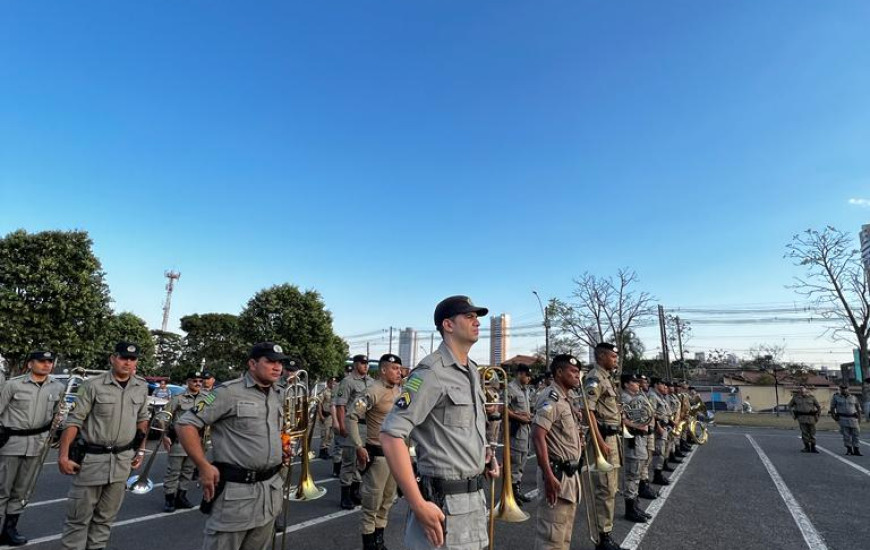Na ocasião os Alunos do Curso de Habilitação de Oficiais - CHOM estão sendo qualificado no Estágio Técnico em parceria com a Corpo Musical da PMGO.