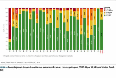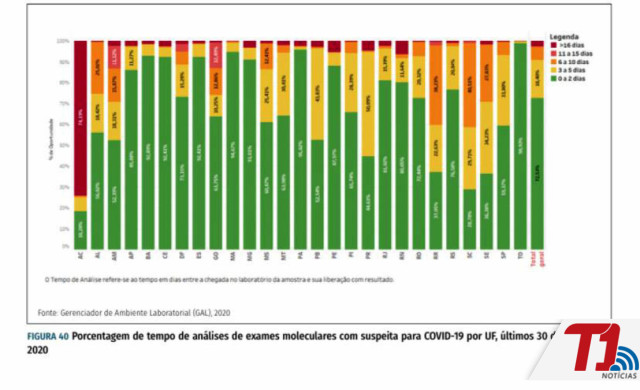 Ainda segundo o boletim do MS, nos últimos 30 dias, 72,53% dos resultados dos exames para Covid-19 foram liberados de 0 a 2 dias e, neste contexto, o Tocantins se destacou com 98,93% das amostras analisadas neste prazo.