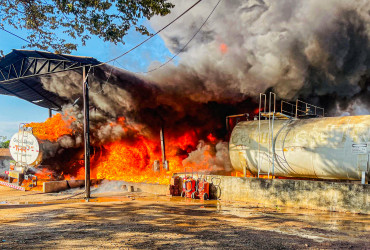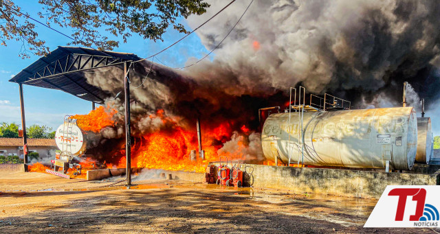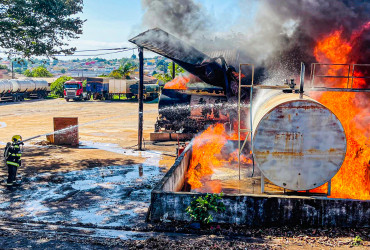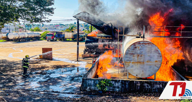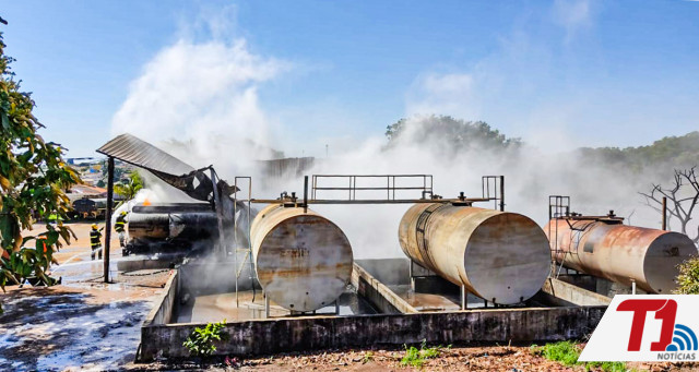 Além do caminhão em chamas, ainda havia outros dois para transporte de combustível estacionados ali perto, mais um caminhão carregado com pallets de madeira e três tanques de combustíveis na altura do solo, e cheios do produto.