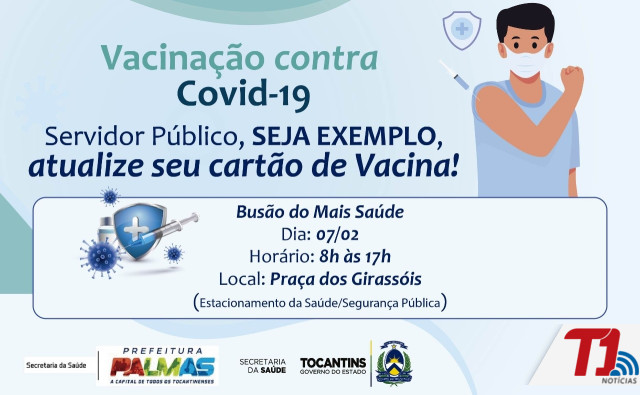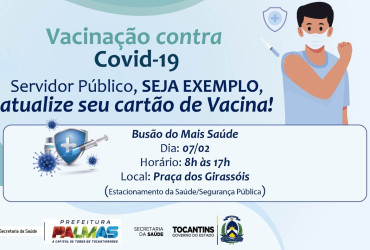 O “Busão do Mais Saúde” estará na segunda-feira, 07, estacionado entre as Secretaria de Estado da Saúde (SES) e Segurança Pública (SSP-TO), das 8h às 17h, aplicando vacinas contra a Covid-19 para maiores de 12 anos. O governador em exercício, Wanderlei Barbosa, convocou todos os servidores estaduais que ainda não se vacinaram ou estão com as doses de vacinas contra a Covid-19 em atraso, para completar seu ciclo vacinal. A ação é em parceria com a Prefeitura de Palmas.