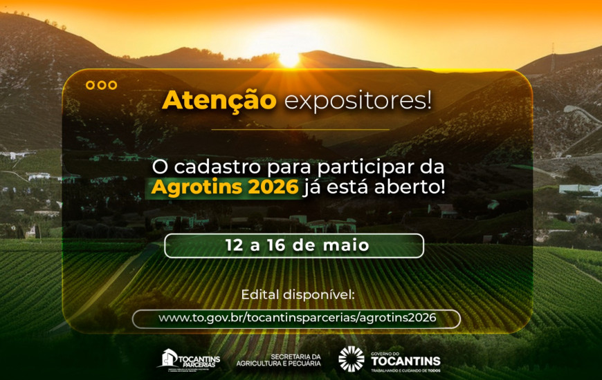 Está aberto o cadastro para expositores interessados em participar da 26ª edição da Feira de Tecnologia Agropecuária do Tocantins - Agrotins 2026, que será realizada de 12 a 16 de maio, no Parque Agrotecnológico Engenheiro Agrônomo Mauro Medanha, em Palmas. Promovida pelo Governo do Tocantins, por meio da Secretaria de Estado da Agricultura e Pecuária do Tocantins (Seagro), a feira é considerada a maior de tecnologia agropecuária da Região Norte e uma das maiores do país, reunindo inovação, oportunidades de negócios e as principais tendências do agronegócio.