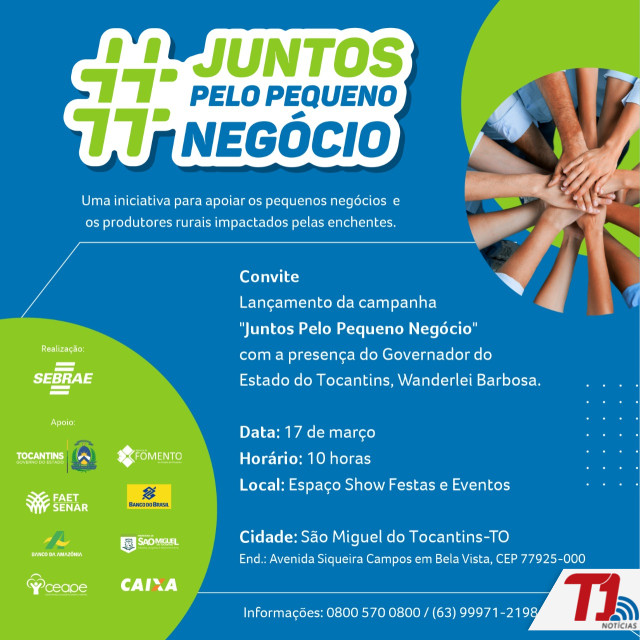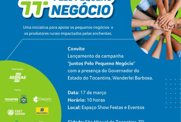 "Juntos pelo pequeno negócio" é uma iniciativa do Sebrae Tocantins para apoiar os pequenos negócios e os produtores rurais de municípios impactados pelas enchentes. O lançamento da campanha acontece nesta quinta-feira, 17, às 10h, em São Miguel, região do Bico do Papagaio e contará com a presença do governador Wanderlei Barbosa, gestores municipais e parceiros.