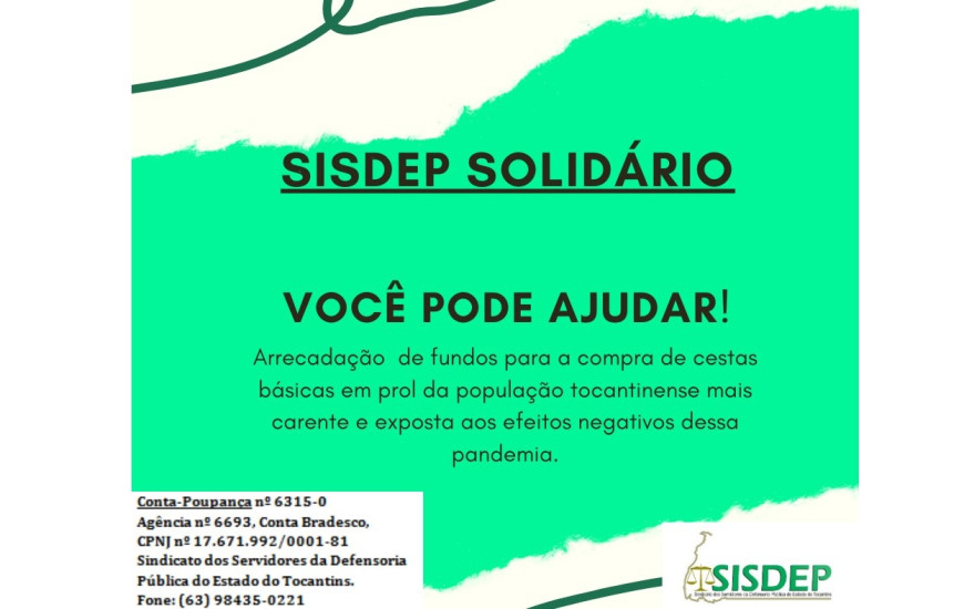 Diante da situação atual provocada pela pandemia do coronavírus e sensível aos seus efeitos negativos, principalmente em relação aos grupos mais vulneráveis, os servidores da Defensoria Pública do Estado do Tocantins, por meio de campanha solidária organizada pelo SISDEP - Sindicato dos Servidores, estão mobilizados para a arrecadação e aquisição de cestas básicas.