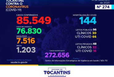 Desta forma, hoje o estado soma 272.656 pessoas notificadas com a Covid-19 e acumula 85.549 casos confirmados. Destes, 76.830 pacientes estão recuperados, 7.516 pacientes seguem em isolamento domiciliar ou hospitalar e 1.203 pacientes foram a óbito.