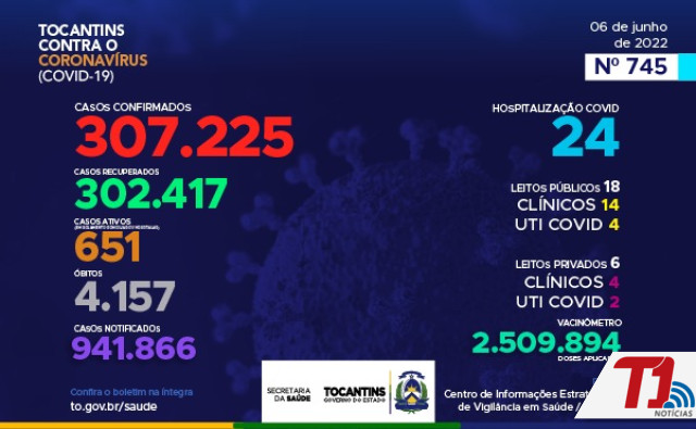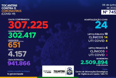 O boletim epidemiológico nº 745 informa que 24 pessoas estão hospitalizadas no Tocantins. Deste total, 18 estão em leitos públicos, sendo 14 em leitos clínicos e outros 4 em UTIs Covid. Já nos leitos privados, são 4 em clínicos e 2 em UTIs Covid, totalizando 6.