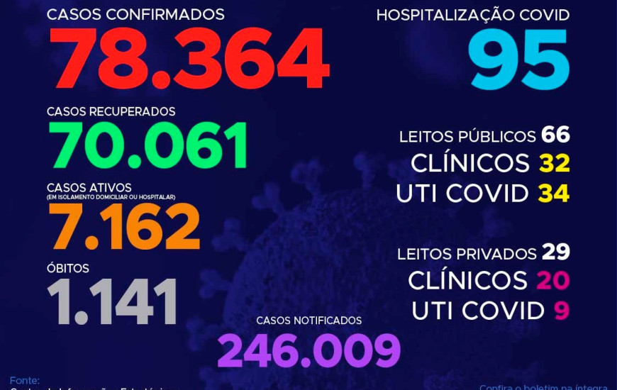 Desta forma, hoje o estado soma 246.009 pessoas notificadas com a Covid-19 e acumula 78.364 casos confirmados. Destes, 70.061 pacientes estão recuperados 7.162 pacientes seguem em isolamento domiciliar ou hospitalar e 1.141 pacientes foram a óbito.