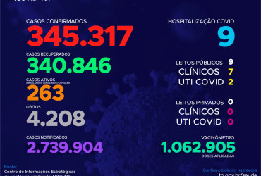 Com os novos dados, atualmente o Estado contabiliza 1.062.905 pessoas notificadas com a Covid-19 acumula 345.317 casos confirmados. Destes 340.846 estão recuperados, 263 pacientes seguem em isolamento domiciliar ou hospitalar e 4.208 foram a óbito.