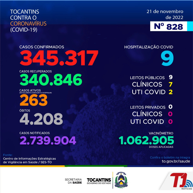 O boletim epidemiológico nº 828 informa que 9 pessoas estão hospitalizadas no Tocantins. Deste total, 9 estão em leitos públicos, sendo 7 em leitos clínicos e outros 2 em UTIs Covid. Já nos leitos privados, são 0em clínicos e 0 em UTIs Covid.
