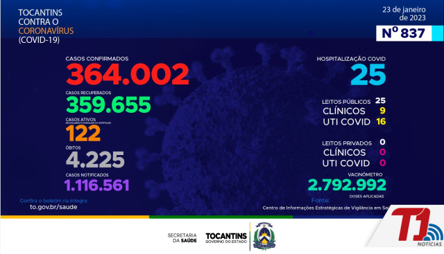 O boletim epidemiológico nº 837 informa que 25 pessoas estão hospitalizadas no Tocantins. Deste total, 25 estão em leitos públicos, sendo 9 em leitos clínicos e outros 16 em UTIs Covid. Já nos leitos privados, são 0 em clínicos e 0 em UTIs Covid.