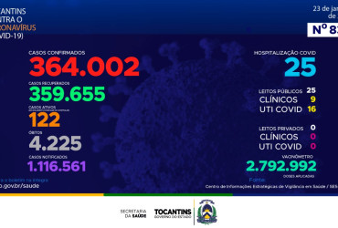 O boletim epidemiológico desta segunda-feira, 23 de janeiro, contabilizou 753 novos casos de Covid-19 no Tocantins, sendo 3 nas últimas 24 horas. Os restantes são de exames coletados em dias anteriores e que tiveram seus resultados inseridos no sistema, pelos municípios, na data de ontem. Dos novos casos, 133 foram detectados por RT-PCR, 55 sorologia e 565 por testes rápidos.