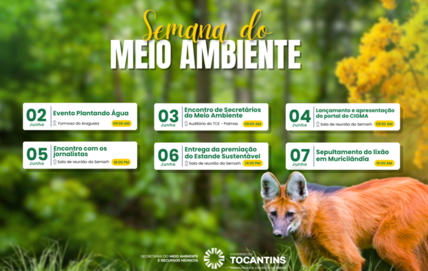 Ocorrerá entre os dias 2 e 7 de junho a Semana do Meio Ambiente, iniciativa que leva o tema "Ações que transformam o presente e garantem o futuro" e visa consolidar políticas públicas, fortalecer a governaça e ampliar a preservação dos recursos naturais. O evento será em três cidades: Formoso do Araguaia, Palmas e Muricilândia.
