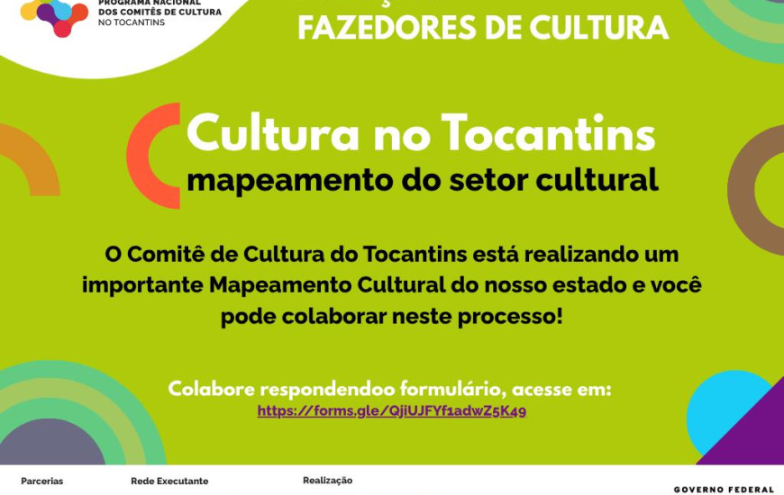 O Comitê de Cultura no Tocantins convida artistas, grupos, coletivos, produtores e agentes culturais a participarem e contribuírem para o fortalecimento da rede cultural tocantinense, por meio do Mapeamento Cultural, que tem o objetivo de reunir informações sobre as práticas, ações e agentes culturais que movimentam a cena artística em todo o estado.