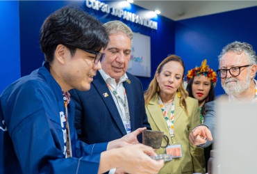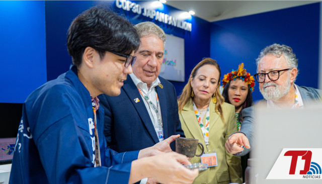 O governador Laurez Moreira, acompanhado da primeira-dama e desembargadora, Ângela Prudente, aproveitou a programação da COP30 para visitar o estande do Japão, onde foi recebido por representantes do Ministério do Meio Ambiente. No local, o chefe do Executivo conheceu as tecnologias de última geração voltadas à gestão de resíduos sólidos, monitoramento por satélite da agricultura e do meio ambiente, além de soluções inovadoras para a geração de hidrogênio verde a partir de energias renováveis.