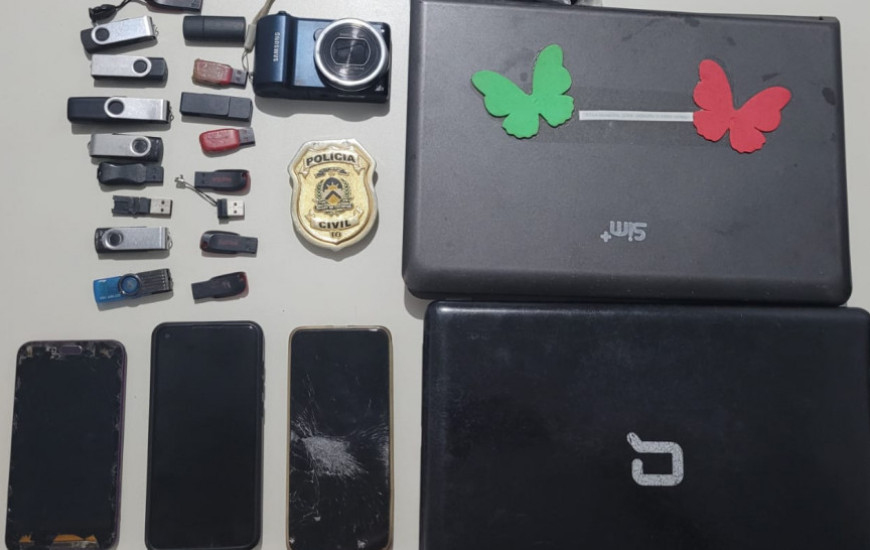A polícia apreendeu diversos equipamentos eletrônicos na residência do acusado, incluindo pen drives, notebooks, celulares e uma câmera fotográfica. O material está sendo periciado para verificar a existência de conteúdo envolvendo pornografia infantil.